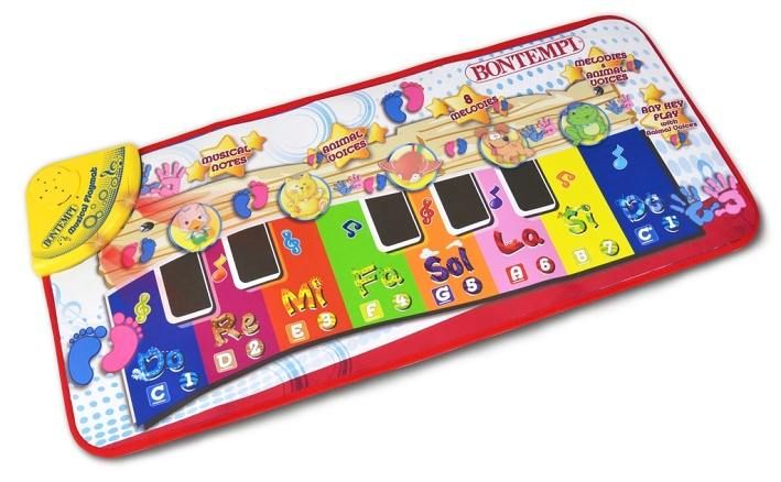 Interaktivní piano nášlapné pro nejmenší – 8 klávesové nášlapné piáno, má 10 přednahraných melodií, 8 hudebních not, 5 zvířátkových hlasů, kontrolu hlasitost. Na baterie: 3x AA (nejsou součástí balení)