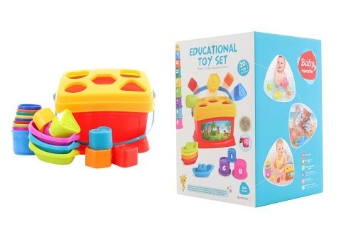 Plastová sada pro nejmenší děti. Balení obsahuje vkládačku s 5i tvary, 9 kalíšku k postavení do pyramidy a 3 lodičky. Baleno v krabici. Rozměry balení cca 14,5x21x14,5 cm. Věk 6m+