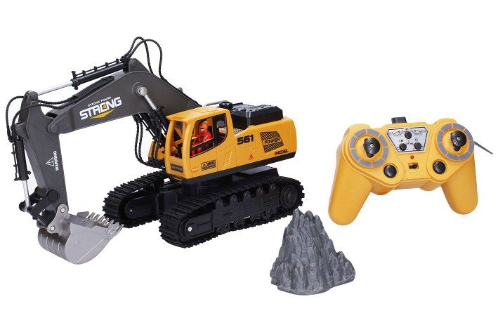 Bagr kouřící RC na dálkové ovládání. Rozměry 35x11,8x24 cm. Frekvence 2. 4GHz. Světelné, zvukové a kouřové efekty. Ovladač - levá páčka - pohyb dopředu a dozadu, pravá páčka - otáčení základny doleva a doprava, levé velké tlačítko - zvedání nabíracího ramene, pravé velké tlačítko - pokládání nabíracího ramene, 3 malá tlačítka - klakson, demo režim, kouřové efekty. Nádržka na vodu v horní části bagru. Nádobka na vodu, šroubovák, náhradní kovová hydraulická ramena, hornina součástí. 3. 7V bateriový pack do bagru součástí, 2xAA do ovladače nejsou součástí. USB kabel součástí. Přepínač ON/OFF na bagru a na ovladači.