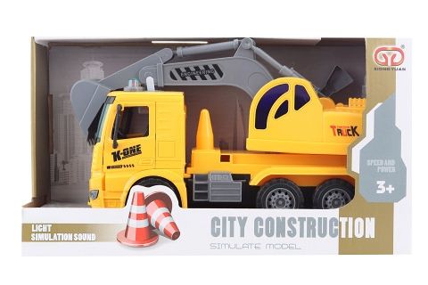 Plastové nákladní auto - bagr na baterie. Pomocí dvou tlačítek umístěných na kabině vydává zvuky jízdy a couvání. Baterie 3xAG13 jsou součástí balení. Manuálně lze ovládat lžíci. Baleno v krabici. Rozměry balení cca 32x11,5x18x5 cm. Rozměry auta cca 25x17x9 cm. Věk 3+