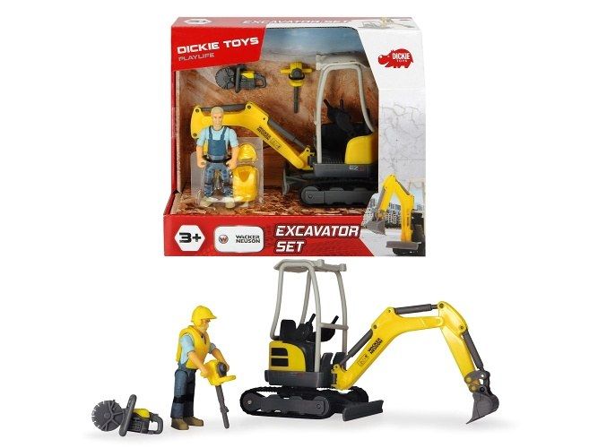Pásový bagr Wacker Neuson EZ17 na volnoběh. Součástí figurka dělníka s helmou a vestou, bourací kladivo a flexa. V měřítku 1:24, délka 19,5 cm.