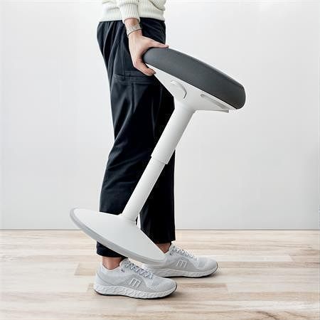 Ergonomická balanční stolička, umožňuje flexibilitu při práci mezi sezením a stáním, podporuje pohyb svalů, zlepšuje držení těla.