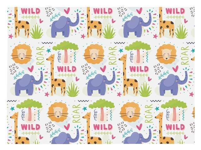 Ve stylu safari! Veselý dětský balicí papír s motivem safari je jako stvořený pro dárky pro děti. Lvíčci, sloni, žirafy, palmy i nápisy WILD a ROAR v barevném a hravém provedení vykouzlí úsměv ještě dřív, než se dárek rozbalí. Papír je vyroben v prémiové LUX kvalitě – je pevný, lesklý a snadno se s ním pracuje. Díky univerzálnímu designu se hodí pro dívky i chlapce a využijete ho při každé příležitosti – narozeniny, svátek, školní oslavy nebo jen tak pro radost. Balení: 25 ks Gramáž: 80 g Motiv: safari zvířata Rozměr archu: 1000 x 700 mm Všech 25 ks je baleno v sáčku. Uvedená cena je za 1 ks.