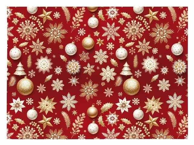 Elegantní vánoční klasika! Sytě červený podklad a bohaté zlaté motivy – sněhové vločky, vánoční baňky, větvičky i jemné detaily, které dýchají sváteční atmosférou. Právě tento dojem v sobě nese balicí papír z řady Klasik, který spojuje tradici, vkus a špetku luxusu a promění každý dárek v opravdovou ozdobu Vánoc. Upoutá na první pohled, dodá dárkům styl a podtrhne celkový dojem péče a pozornosti. Ideální pro ty, kteří si potrpí na krásné detaily a chtějí potěšit už samotným balením. Gramáž: 70 g Balení: 150 ks Rozměr archu: 1000 x 700 mm Motiv: sněhové vločky, vánoční baňky Všech 150 ks je baleno v sáčku v kartonové krabici. Uvedená cena je za 1 ks.