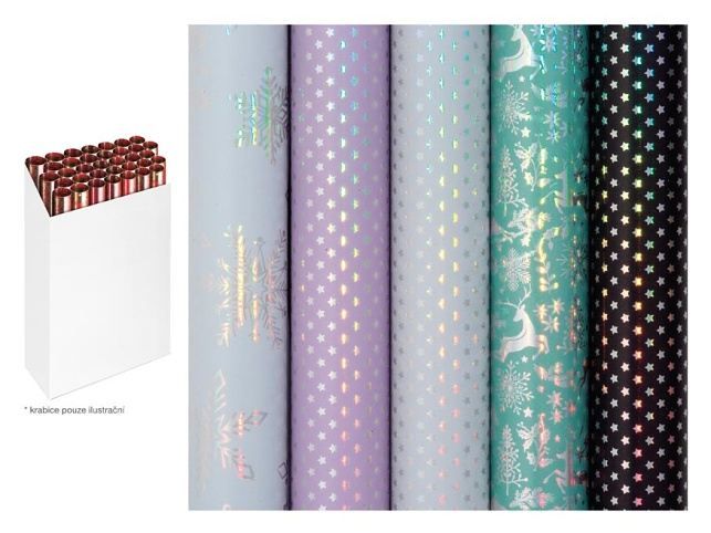 Balicí papír - vánoční role - 5 různých vzorů - U vánočního dárku je velmi důležitý obsah, ale i to, aby byl u stromečku krásně zabalený. Pořiďte si u nás dárkový balící papír s vánočním motivem. Nezapomeňte si koupit i pěknou stužku a jmenovky na dárek. Velikost role: 150x70cm Balení: 35 ks Vzor: různé vánoční holografické vzory - viz obrázek Uvedená cena je za 1 ks. Všech 35 ks je baleno v kartonové krabici.