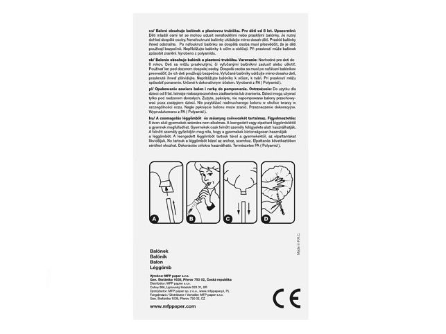Nafukovací fóliový balónek ve tvaru čísla 2. Balónek je vyroben ze stříbrné folie. Na horní straně balónku jsou očka na přivázání. Balónky jsou vhodné na narozeninové oslavy, firemní párty a jiné společenské události. Výška balónku: 40 cm Uvedená cena je za 1ks Balení obsahuje: balónek, brčko na nafukování, návod Návod k nafouknutí balónku: 1. vybalte balónek a plastové brčko z obalu 2. zasuňte brčko do otvoru k nafukování, který je umístěný na spodní straně balónku 3. foukáním přes brčko nafoukněte balónek 4. opatrně vytáhněte brčko z balónku ven (systém je navržen tak, že nemusíte ústí balónku zavazovat) 5. k vyfouknutí balónku zasuňte brčko opět do otvoru a tlačte na balónek Varování: Vhodné pro děti od 8 let. Děti se mohou prasklými či vyfouknutými balónky zadusit nebo uškrtit. Používejte pouze pod dozorem dospělé osoby. Dospělá osoba se po nafouknutí balónku musí přesvědčit, že jej děti používají bezpečně. Vyfouklé balónky udržujte mimo dosah dětí a prasklé ihned zlikvidujte. K nafukování balónků použijte pumpičku. Nepřibližujte balónky k očím a obličeji. Při prasknutí může balónek způsobit zranění. Vyrobeno z přírodního kaučuku, latexu. Určeno k dekorativním účelům. Nebezpečí vdechnutí a spolknutí malých částic.