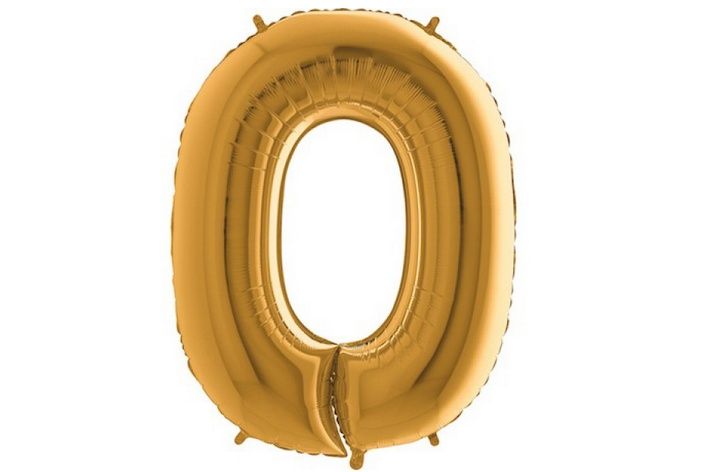 Foliový balónek ve tvaru číslice 0 ve zlaté barvě.