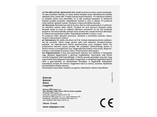 Varování: Vhodné pro děti od 8 let. Děti se mohou prasklými či vyfouknutými balónky zadusit nebo uškrtit. Používejte pouze pod dozorem dospělé osoby. Dospělá osoba se po nafouknutí balónku musí přesvědčit, že jej děti používají bezpečně. Vyfouklé balónky udržujte mimo dosah dětí a prasklé ihned zlikvidujte. K nafukování balónků použíjte pumpičku. Nepřibližujte balónky k očím a obličeji. Při prasknutí může balónek způsobit zranění. Vyrobeno z přírodního kaučuku, latexu. Určeno k dekorativním účelům. Nebezpečí vdechnutí a spolknutí malých částic.
