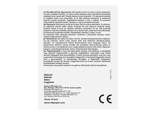 Nafukovací balónek s potiskem Všechno nejlepší. Ideální na narozeninovou párty. mix barev. mix barev 12 ks v balení cena je uvedena za 1 balení Varování: Vhodné pro děti od 8 let. Děti se mohou prasklými či vyfouknutými balónky zadusit nebo uškrtit. Používejte pouze pod dozorem dospělé osoby. Dospělá osoba se po nafouknutí balónku musí přesvědčit, že jej děti používají bezpečně. Vyfouklé balónky udržujte mimo dosah dětí a prasklé ihned zlikvidujte. K nafukování balónků použíjte pumpičku. Nepřibližujte balónky k očím a obličeji. Při prasknutí může balónek způsobit zranění. Vyrobeno z přírodního kaučuku, latexu. Určeno k dekorativním účelům. Nebezpečí vdechnutí a spolknutí malých částic.