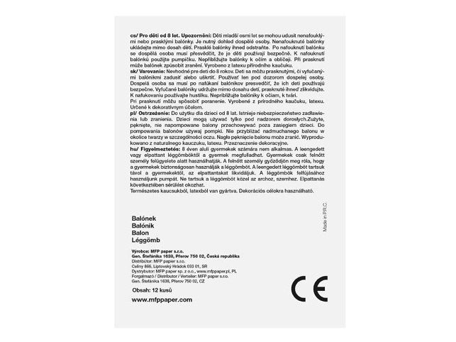 Nafukovací balónek, transparentní s barevným potiskem - balónky jsou oblíbeným dekoračním doplňkem na narozeninové oslavě či jiné významné události. Nafukovací balónky nesmí chybět na žádné oslavě, dodají tu pravou atmosféru do celé místnosti a narozeninová párty může začít! BALENÍ OBSAHUJE: - 12 ks transparentních balónků (srdíčka nebo čtyřlístky) VAROVÁNÍ: Vhodné pro děti od 8 let. Děti se mohou prasklými či vyfouknutými balónky zadusit nebo uškrtit. Používejte pouze pod dozorem dospělé osoby. Dospělá osoba se po nafouknutí balónku musí přesvědčit, že jej děti používají bezpečně. Vyfouklé balónky udržujte mimo dosah dětí a prasklé ihned zlikvidujte. K nafukování balónků použíjte pumpičku. Nepřibližujte balónky k očím a obličeji. Při prasknutí může balónek způsobit zranění. Vyrobeno z přírodního kaučuku, latexu. Určeno k dekorativním účelům. Nebezpečí vdechnutí a spolknutí malých částic. Uvedená cena je za 1 balení po 12 ks.