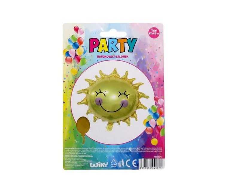 Balónek nafukovací ve tvaru slunce. Rozměry: 67x68 cm ve vyfouklém stavu.