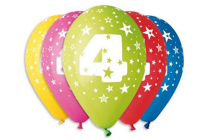 Mix barev s potiskem číslice 4, průměr: 30 cm. Balení obsahuje 5 ks balónků.