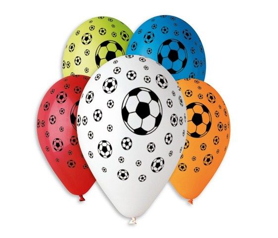 Mix barev s potiskem fotbalových míčů, průměr: 30 cm. Balení obsahuje 5 ks balónků.