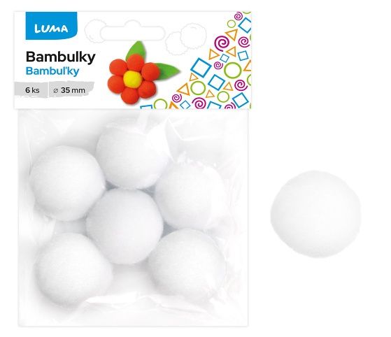Slouží ke kreativním účelům, např. k výrobě zvířátek, obrázků, figurek, očí, nosů, knoflíků, apod. Bambulky bílé 3,5 cm 6 kusů.