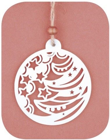 Baňka dřevěná se stromem a hvězdami na zavěšení 9 cm, bílá