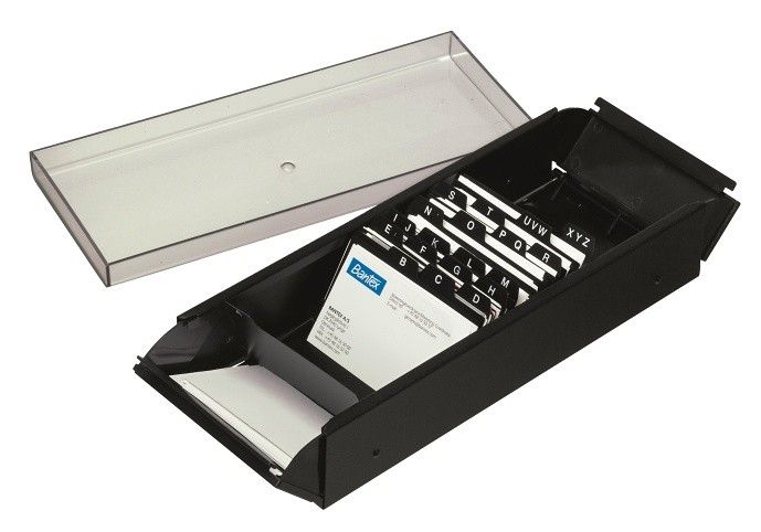 Rozměr 10 x 6,5 x 20 cm, 600 ks vizitek, spodní část z černého plechu, víčko z průhledného plastu. Vyklápěcí přední i zadní čelo, abecední rozlišovač.