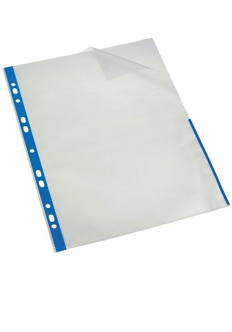 Obal částečně otevřený zboku, čirý, s euroděrováním s barevným rozlišovacím modrým proužkem, 25 ks v balení