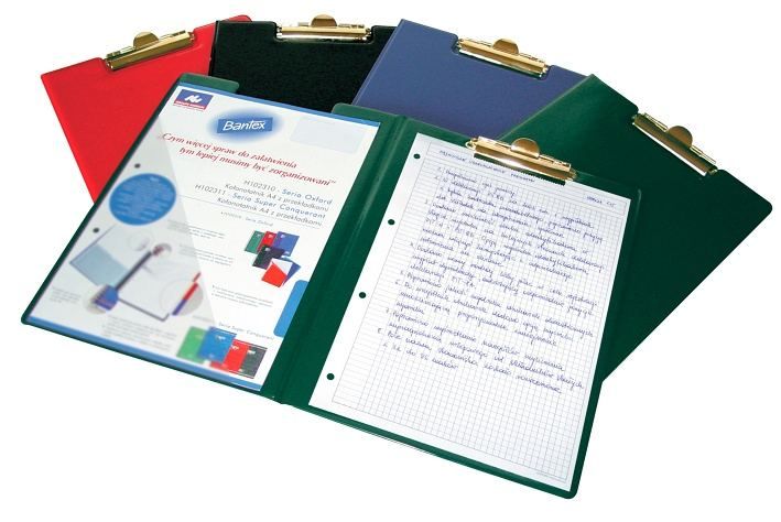 Vnitřní strana desek má kovový klip pro maximální sevření listů, kapacita cca 50 listů, rozšířený rozměr, kapsa na dokumenty, poutko na kuličkové pero, PVC.