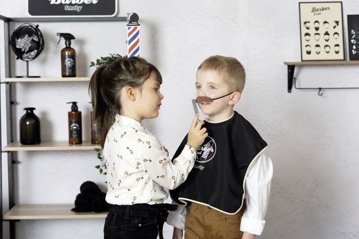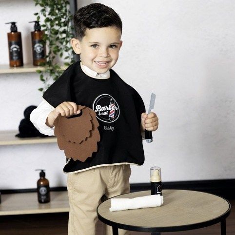 Holičská sada složená z 5 realistických doplňků: vousů, látkového pláště, holicího strojku, lahvičky s holící pěnou a ručník. Vousy mají několik vrstev plsti opatřené systémem suchého zipu, který umožňuje vytvořit více kombinací s různými tvary a délkami