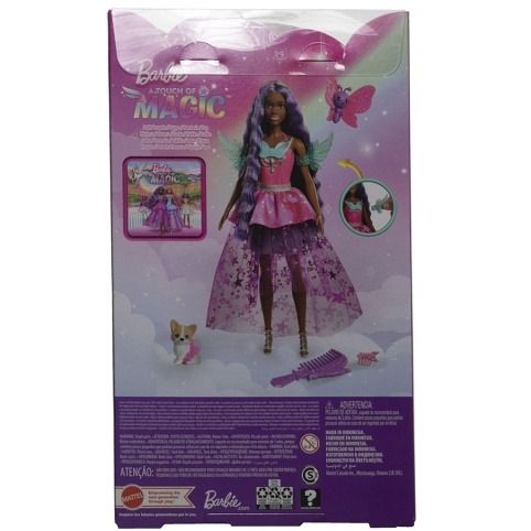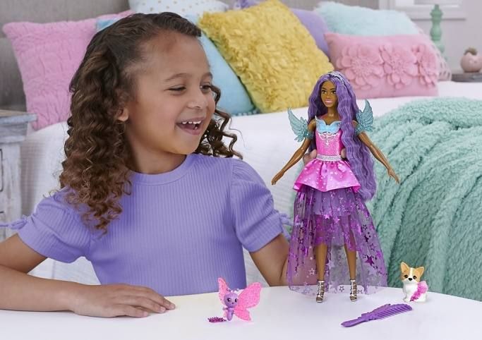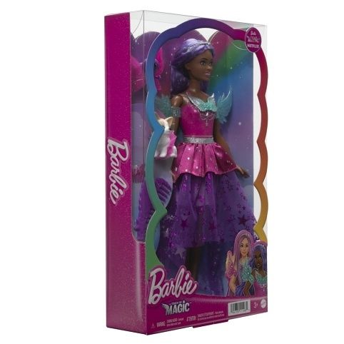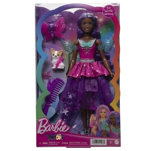 Panenka Barbie® Brooklyn září v šatech inspirovaných jejím kouzelným vzhledem ve filmu Barbie a dotek kouzla! Panenka má na sobě pohádkové šaty s tylovou sukní ozdobenou hvězdami a s detaily křídel na živůtku. Její mazlíčci jsou také báječní, přichází s rozkošným motýlkem a štěňátkem, které nosí roztomilé tutu. Panenka má fialové vlasy o délce 17 cm a doplňky jako hřeben, třpytivou čelenku a ozdobnou sponku do vlasů. Panenka neumí samostatně stát. Barvy a vzhled výrobku se mohou lišit.