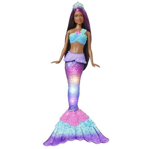 S panenkou Barbie™ Blikající mořská panna brunetka™ se můžete zcela ponořit do vyprávění příběhů. Ponořte tuto krásnou panenku Barbie® do vody a uvidíte, jak její třpytivý perleťový ocas svítí jednou ze čtyř barevných show. Užijte si s panenkou Barbie® šplouchání ve vaně nebo v bazénu anebo nechte děti přenést zábavu i na břeh – stisknutím tlačítka ve tvaru hvězdy na živůtku panenky Barbie® si užijí světelnou show i bez vody. Duhové ploutve, růžový melír a princeznovský diadém doplňují barevný vzhled Barbie® jako mořské panny. Panenka Barbie™ Blikající mořská panna je ideální pro vodní hrátky (nutný dohled rodičů) a je skvělým dárkem pro děti od 3 do 7 let. Panenka neumí samostatně stát nebo plavat. Barvy a vzhled výrobku se mohou lišit. Na baterie: 3x LR44 (jsou součástí balení)