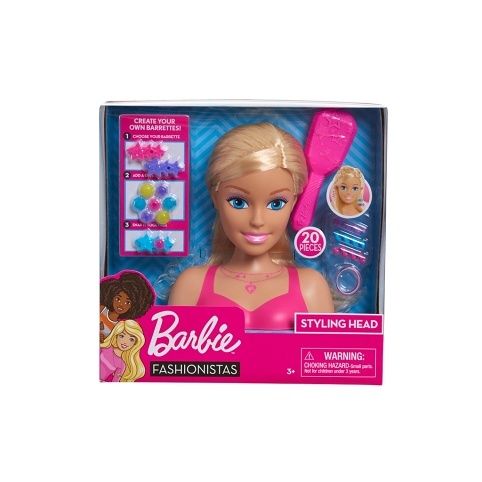 Stylingová hlava je plná stylingové zábavy! Husté vlající vlasy Barbie jsou ideální pro kartáčování, kroucení a spínání do módních účesů! Použijte roztomilé spony a sponky do vlasů, aby se Barbie vyšperkovala. Pro uhlazenější vzhled vyčesejte Barbie vlasy dozadu roztomilým růžovým kartáčem a pomocí zatočených vlasů upravte její kadeře do elegantního drdolu! Můžete si dokonce přizpůsobit vlasové spony pomocí různých vyskakovacích drahokamů! S vaší pomocí bude Barbie nejstylovější dívkou ve městě! Celá sada obsahuje: Jednu stylingovou hlavu Barbie, tři přizpůsobitelné spony, sedm zaskakovacích drahokamů, tři natáčky do vlasů, gumičky do vlasů a jeden kartáč. Věk 3+
