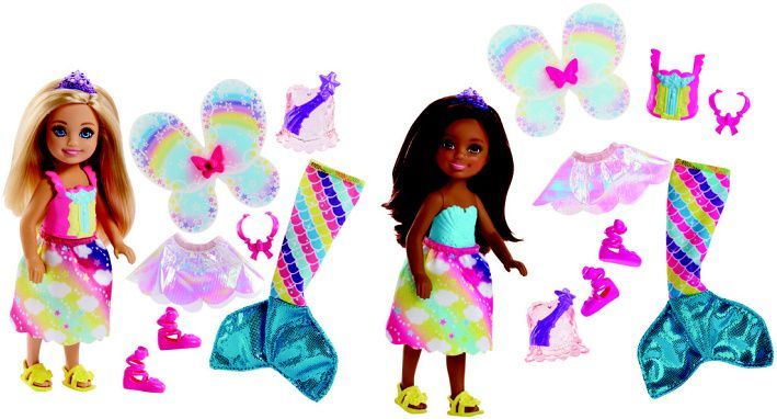 Dej průchod své fantazii a vydej se spolu s panenkou Chelsea™ naprůzkum Duhového království. Panenka Chelsea™ si s sebou vzala třioblečky a může se tak v okamžiku proměnit v princeznu, vílu nebov mořskou pannu. Každý z oblečků svými zářivými barvami a potiskemodráží Duhové království. Obleč panenku Chelsea™ do jednoho ze tříoblečků nebo jednotlivé kousky oblečení kombinuj podle své fantazie.