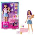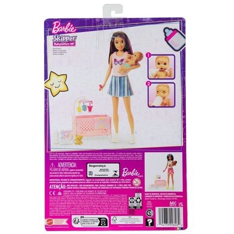 Zahrajte si hru na hlídání dětí s panenkou Skipper™, panenkou miminka a tematickými doplňky. Tento herní set obsahuje postýlku s kolotočem a dalšími doplňky, které usnadňují uspávání miminka. Dejte miminku lahvičku a sledujte, jak se jeho oči pomalu zavírají a miminko usíná. Když lahvičku z pusinky vyndáte, miminko se zase „probudí“. Na postýlce je umístěn kolotoč a nechybí ani medvídek, pohádková knížka a dečka na přikrytí. Panenka Skipper™ má na sobě tílko a sukni a miminko látkovou plenku. Panenka neumí samostatně stát. Barvy a vzhled výrobku se mohou lišit.