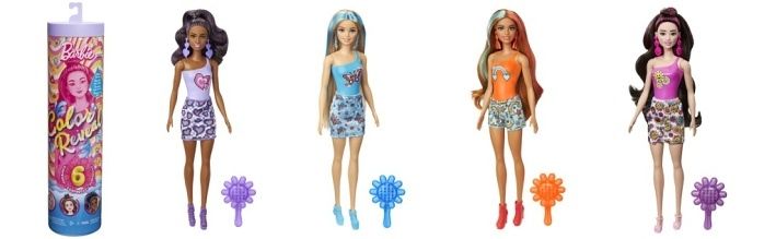 Tato panenka Barbie® Color Reveal™ Divoké vzory potěší děti skvělým nápaditým motivem a překvapením při rozbalování, které zahrnuje panenku Barbie®, stylové módní doplňky a hru se změnou barev. Prodávají se samostatně dle aktuální nabídky. Panenky neumí samostatně stát. Barvy a vzhled výrobku se mohou lišit.
