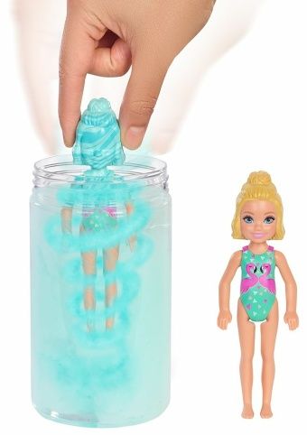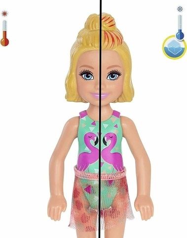 Panenky Barbie® Chelsea ™ Color Reveal ™ přinášejí překvapení při rozbalování! Panenka s trendy módou je zaručena, ale vzhled každé panenky zůstává záhadou, dokud není odhalen. Balení je součástí zábavy – zatažením za proužek odstraníte vnější vrstvu a odhalíte průhlednou tubu. Uvnitř je tajemná mramorová fialová panenka Chelsea ™ Color Reveal ™ a šest dalších překvapení. Všechny je vyjměte a naplňte tubu teplou vodou, poté vložte panenku a zatočte s ní. Voda se změní na pastelově fialovou a po vytažení panenky se odhalí její vzhled! Každá panenka má jinou kombinaci barevných vlasů, tónu pleti a zdobených plavek, ale překvapení pokračují…otevřete další sáčky a naleznete zakrytí nebo sarong, boty, ručník a plážový doplněk. Pomocí ledově studené vody proměňte vlasy a živůtek panenky. S použitím teplé a ledově studené vody mohou děti opakovat tento úžasný okamžik znovu a znovu! Prázdnou tubu využijte na uložení panenčiných doplňků nebo jiných hraček. Jakou panenku odhalíte? Každá panenka se prodává samostatně, v závislosti na dostupnosti. Panenka nemůže stát sama. Barvy a dekorace se mohou lišit.