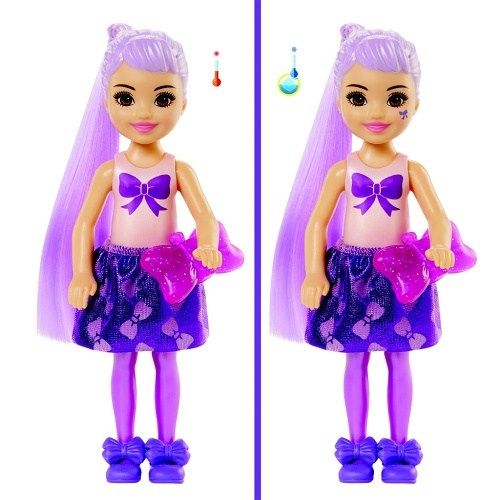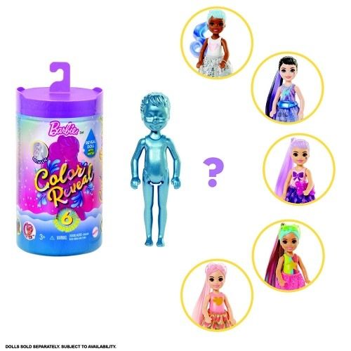Panenky Barbie® Color Reveal™ Chelsea™ přinášejí zážitek z rozbalování plný překvapení – je jich hned šest! Roztomilá panenka Chelsea v třpytivém oblečku je jistá, ale vzhled každé panenky zůstává tajemstvím, dokud není odhalen. Obal je součástí zábavy – zatáhněte za proužek, abyste odstranily vnější vrstvu, a odhalíte průhlednou tubu. Uvnitř je panenka Color Reveal™ Chelsea v tajemné modrozelené metalické barvě a čtyři tašky ukrývající překvapení. Všechny je vyjměte a naplňte tubu teplou vodou, poté vložte panenku a zatočte s ní. Voda změní barvu na metalickou modrozelenou a když je panenka vytažena, odhalí se její rysy! Každá panenka má jinou kombinaci barvy očí, vymodelovaných metalických vlasů, tónu pleti, zdobeného živůtku a lesklých metalických nohou, ale překvapení pokračují … otevřete tašky a naleznete paruku s culíkem, třpytivou sukni a sladěné boty a módní doplněk! Použijte ledově studenou vodu, abyste odkryly zábavnou dekoraci obličeje na tváři panenky Chelsea™ – děti mohou znovu a znovu opakovat tento okamžik úžasu! Každá série má jedinečné téma – tyto panenky Color Reveal ™ Chelsea™ jsou celé o lesku a třpytu, a to díky vymodelovaným metalickým vlasům a nohám a barevným nasazovacím parukám s culíkem. Tubu využijte na uložení těchto a dalších oblíbených doplňků Barbie® a Chelsea™. Jakou panenku odhalíte? Děti je mohou sbírat, aby kombinovaly a přiřazovaly doplňky a rozšiřovaly možnosti. Každá se prodává samostatně, v závislosti na dostupnosti. Barvy a dekorace se mohou lišit.