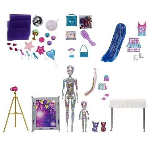 Kolekce Barbie® Color Reveal™ párty herní set přináší ty nejlepší zážitky při otevírání balení s více než 50 překvapeními, včetně panenky Barbie® Color Reveal™ a panenky Color Reveal™ Chelsea™ schovaných ve stříbřitě kovové vrstvě s barevnými konfetami. V balení, které můžete využít i jako adventní kalendář, najdete i dvě Color Reveal™ zvířátka v metalické růžové a fialové! Balení obsahuje panenku Barbie, panenku Chelsea a dvě zvířátka, ale jejich vzhled je skrytý dokud není odhalen. Uvnitř balení naleznete také více než 50 doplňků s překvapením ukrytých v 21 krabičkách.