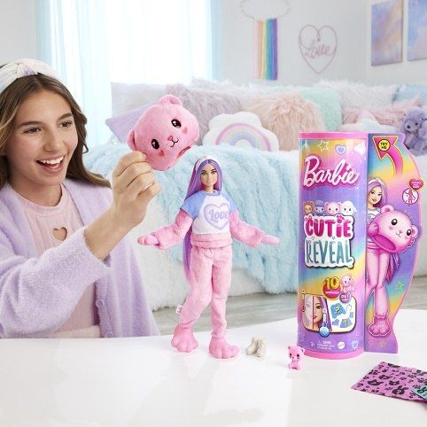 Panenka Barbie® Cutie Reveal™ z pastelové edice potěší děti roztomilým motivem trička a při rozbalování je čeká překvapení v podobě panenky Barbie®, mini zvířátka, stylové módy, možnosti využití 2 v 1 a hry se změnou barev. Barbie® Cutie Reveal™, to není jen největší a nejúžasnější překvapení na světě, ale také hned dvě hračky v jednom jediném balení! Plyšový kostým skrývá pravou identitu panenky pod maskou roztomilého zvířátka. Otevřete pestrobarevný obal, ve kterém najdete panenku v plyšovém kostýmu zvířátka a odhalte, která panenka se v kostýmu skrývá! Dalším překvapením jsou tajemné sáčky, které ukrývají doplňky. Děti si zamilují objevování všech roztomilých překvapení v této sérii Barbie® Cutie Reveal™. Prodávají se samostatně v závislosti na dostupnosti. Panenka neumí samostatně stát. Barvy a vzhled výrobku se mohou lišit.