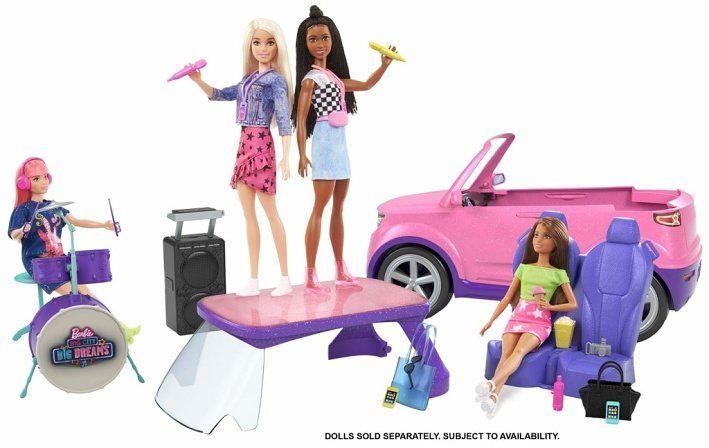 Staňte se hvězdou, kdykoliv a kdekoliv! Vezměte auto na vzrušující jízdu plnou zábavy a hudebního dobrodružství! Barbie DHA transformující se auto se během pár okamžiků může stát pódiem. Stačí zaparkovat, vysunout sedačky a přestavit auto na pódium. Získejte si své fanoušky neodolatelným vystoupením. V balení auta Barbie naleznete více než 20 tematických doplňků včetně bicí soupravy a stoličky, reproduktoru a otočného stolu, mikrofonů a mnohé další. Barbie DHA transformující se auto je vhodné pro holčičky od 3 let. Panenky se prodávají samostatně a barvy a vzhled se můžou lišit na základě skladových možností.