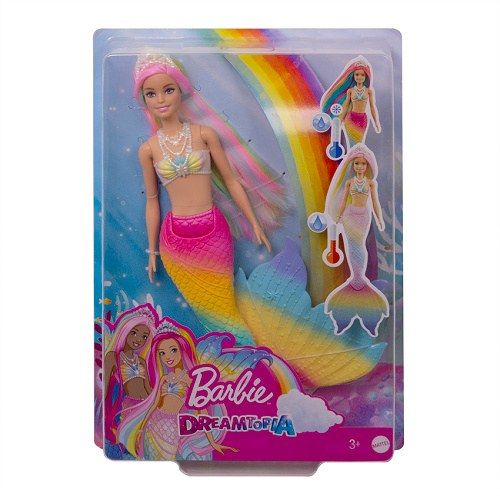 Tato panenka Barbie ™ Dreamtopia Rainbow Magic ™ Mořská panna se vyznačuje barevnými proměnami, díky nimž se představivost může ponořit do svých dosud nejbarvitějších pohádek! Panenka Barbie® mořská panna má neonově zářivý fantazijní vzhled s čelenkou ve svých duhových vlasech, zářivým vícebarevným ocasem a živůtkem s prvky inspirovanými mořem. Jste připraveni na transformaci barev? Ponořte panenku Barbie® do teplé vody a sledujte, jak její vlasy, živůtek a ocas okamžitě mění barvu a odhalují duhu hezkých pastelových barev! Ponořte ji do ledově studené vody, abyste viděli její proměnu zpět do původního neonově jasného vzhledu a znovu a znovu prožívejte transformaci. Panenka nemůže plavat nebo zůstat sama. Barvy a dekorace se mohou lišit.