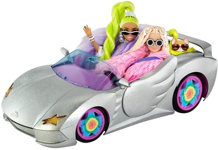 Pokud jde o styl, panenky Barbie® Extra volí heslo “čím více, tím lépe” – a toto Barbie® Extra auto není výjimkou! Děti mohou vyrazit na cestu ve velkém stylu s tímto sportovním dvoumístným kabrioletem s třpytivě stříbrným lakem, charakteristickým růžovým interiérem, s duhovými ráfky, dveřmi inspirovanými křídly a chlupatými opěrkami hlavy. Když je čas na změnu outfitu, otevřete kufr – je v něm místo na uložení páru bot a módního oblečku, přičemž je obojí součástí balení! Díky mnoha zábavným doplňkům si děti s tímto autem Barbie® Extra mohou vzít EXTRA atmosféru s sebou, ať už jedou kamkoli! Panenky se prodávají samostatně. Barvy a vzhled výrobku se mohou lišit.