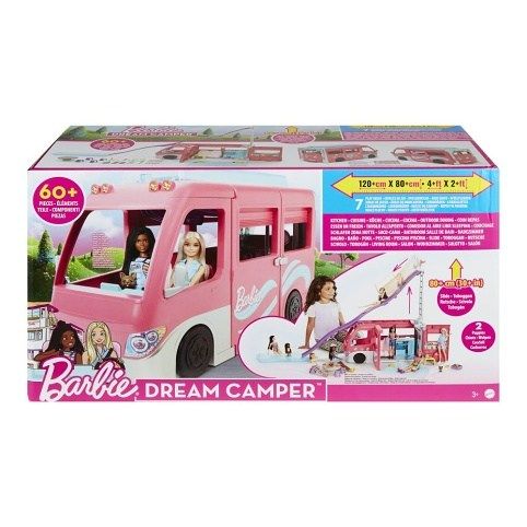 S Barbie® Karavanem snů s obří skluzavkou si užijete dokonalé kempování! Děti mohou karavan naložit a odjet do vysněné destinace - pojízdná kola a dvoumístná kabina inspirují k realistické hře. Obytný vůz se otevře a odhalí tři patra se sedmi hracími zónami včetně kuchyně, jídelny, prostoru na spaní, bazénu, ohniště a prostoru pro hraní se zvířaty. Když jsou děti připravené na dovádění, mohou své panenky (prodávají se samotatně) přenést do horního patra a poslat je dolů po impozantní skluzavce přímo do bazénu! Možnosti hraní jsou nekonečné díky 60 dílkům, včetně štěněte a všeho, co malí dobrodruzi potřebují k vyprávění parádních kempinkových příběhů. Panenky se prodávají samostatně. Barvy a vzhled výrobku se mohou lišit.