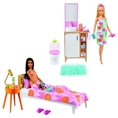 Sady panenek a nábytku Barbie® promění každodenní prostor v něco zvláštního! Každý herní set pokojíčku obsahuje nábytek a příslušenství, které lze uspořádat a přeskupit tak, aby se vytvořily nové scény a možnosti vyprávění. Vyberte si ze sady ložnice nebo koupelny, každá má tematické kousky a jedinečný vzhled pro panenku Barbie®. Moderní design a studené barvy inspirují styl a menší doplňky dodávají hře realistické detaily. Ať už je dají do svého domečku pro panenky Barbie® (prodává se samostatně), nebo si s nimi hrají samostatně, panenky Barbie® a sady nábytku jsou skvělými dárky pro děti ve věku od 3 do 7 let. Každá se prodává samostatně, v závislosti na dostupnosti. Panenky nemohou zůstat samy. Barvy a dekorace se mohou lišit.