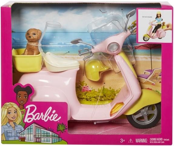 S tímto skútrem Barbie® si užijete spoustu zábavy. Skútr je navržen v růžové a žluté barvě se stříbrnými prvky, a je moderní a stylový. Panenku Barbie® (prodává se samostatně) na sedadle drží klip. Balení obsahuje skútr Barbie® s košíkem, štěňátkem a helm