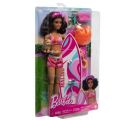 Vzhůru do surfování! S touto panenkou Barbie® si děti mohou zahrát na dokonalý den na pláži. Součástí balení je surfovací prkno, štěňátko a tematické doplňky. Surfovací prkno s groovy potiskem drží panenku na místě pomocí klipů na nohy a řemínku na kotník, zatímco ona se prohání na vlnách. Panenka Barbie® má na sobě sportovní plavecký obleček s čelenkou a je dodávána s hravým štěňátkem. Je pořádně natěšená na zábavu na slunci a má polohovatelné tělo, které umožňuje realistický pohyb! Mezi další doplňky patří záchranná vesta, ručník, stereo, frisbee, sluneční brýle, láhev s vodou, opalovací krém, banán a další. Panenka neumí samostatně stát. Barvy a vzhled výrobku se mohou lišit.