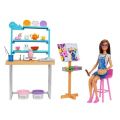 Připojte se k Barbie® Uměleckém ateliéru™! Vyjměte hmotu z nádoby a vyválejte z ní kuličku, tu umístěte do formy, přitlačte! Poté postavte vytvořenou vázu na otočný kruh a vyberte si razítko (srdíčka nebo hvězdičky). Otočte kruhem, aby se na výtvor udělal otisk. Namočte houbičkový štětec do ledově studené vody a natřete bílé kousky: malé prasátko má na zádech modré skvrny, talířek ve tvaru srdce má růžová srdíčka a medvídek má fialové oči. Děti si mohou s hmotou hrát a tvořit znovu a znovu! Panenka Barbie® může také předstírat, že maluje, má na výběr ze dvou barevných pláten. Herní set obsahuje panenku Barbie® s ohebnými koleny a více než 25 dílků. Panenka neumí samostatně stát. Barvy a vzhled výrobku se mohou lišit. Pro děti od 3 let.