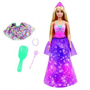 Tato panenka Barbie™ Dreamtopia se vyznačuje fantastickou módní transformací pro dvojnásobnou zábavu při vyprávění příběhů! Se sukní, která se promění ve třpytivý ocas mořské panny, se panenka Barbie® může během několika sekund změnit z princezny na členku podmořské královské rodiny. Jednoduše jí sundejte její princeznovskou sukni, otočte ji naruby, aby se odhalil duhový ocas mořské panny se třpytivými detaily, a připevněte ji zpět na místo, abyste změnily panenčin vzhled! Panenka Barbie® je dodávána s ještě jednou sukní pro ještě větší zábavu z módy a navíc s kartáčem na vlasy, hůlkou, čelenkou, náhrdelníkem a náramkem pro stylizování každého vzhledu. Milovníci pohádek ve věku od 3 let budou rádi znovu a znovu vytvářet vzhled panenky Barbie®! Panenka nemůže plavat nebo zůstat sama. Barvy a dekorace se mohou lišit.