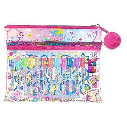 Barevná taštička se dvěma kapsami na zip a přívěškem. V taštičce najdete 1 blok-deníček, 12 gelových per, 1 arch samolepek, 1 zásobník na lepenky a 4 barevné třpytivé lepenky. Vhodné pro děti od 6ti let.