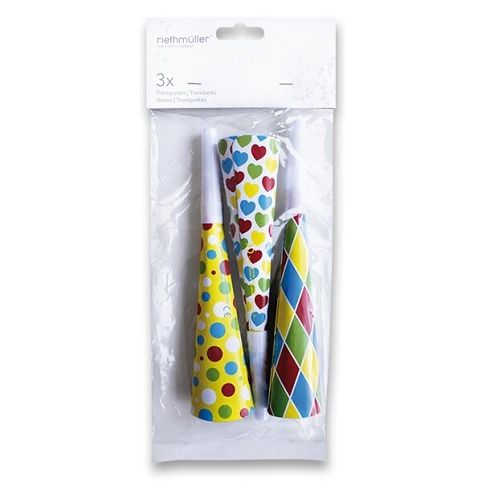 Barevné trumpetky s různými motivy. Materiál kombinace papíru a plastu. Délka 22 cm.