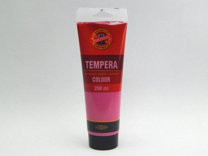 Barva temperová 250ml magenta. Umělěcké temperové barvy určené především pro profesionální výtvarníky, ale používají se při výuce výtvarné výchovy ve školách. Jsou vysoce kvalitní, husté, vzájemně se mísitelné, vodou ředitelné, jsou bezpečné a spolehlivě vypratelné. Jejich kvalitativní parametry, týkající se kryvosti, světlostálosti a složení jsou vždy uvedeny na etiketě. Barvy velmi rychle zasychají a po zaschnutí je lze znovu rozmít vodou. Základem jsou jemně utřené pigmenty rozmíchané do emulze vhodného oleje. Vyráběny v 33 odstínech.