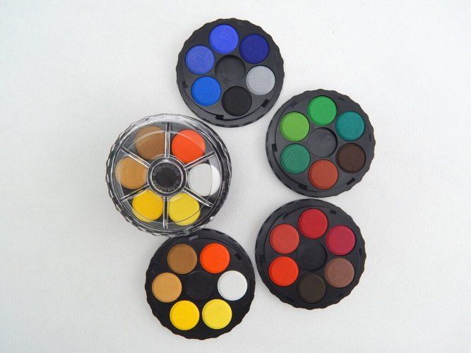Barvy vodové kulaté 24. Školní vodové barvy 24 odstínů s tabletami o průměru 22,5 mm v kulatých, plastových, čtyřpatrových barevnících. Barvy jsou výrazné, vyznačují se svým vysokým obsahem pigmentů. Jsou certifikované a zcela bezpečné pro děti.