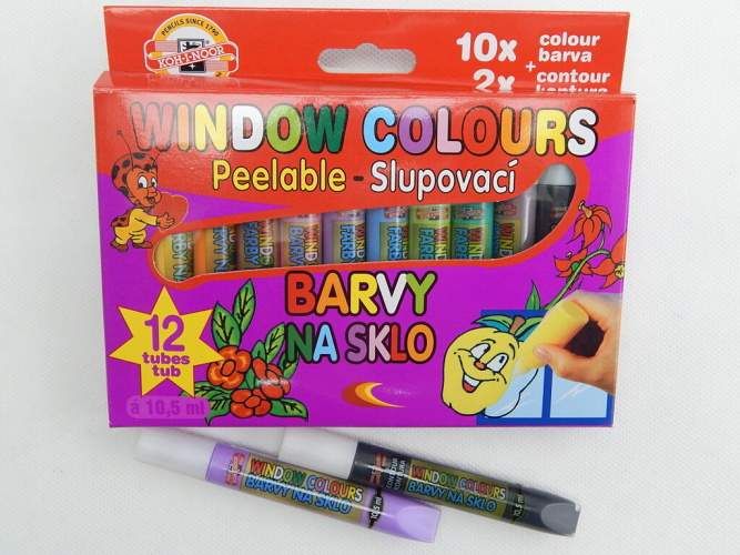 Sada 12 ks 10,5 ml tub v potištěné kartónové skládačce barev na sklo (barvy: bílá, žlutá, světlé modrá, oranžová, červená, tmavě modrá, fialová, světle zelená, tmavě zelená, světlé hnědá, kontura černá, kontura zlatá), přiloženy 2 šablony s motivy na malování, 1 fólie, návod na použití. Barvy na sklo se používají k malování na sklo, zrcadlo, obkladačky a jiné hladké povrchy. Nejprve se barva nanese přímo z tuby na fólii. Po zaschnutí se obrázek z fólie opatrně odtrhne a nalepí na požadovaný povrch. Určeno pro děti starší 3 let. Dítě pozře barvu. Barva projde trávicím traktem bez ovlivnění traktu – dle citlivosti uživatele může vyvolat nevolnost, průjem, zvracení.