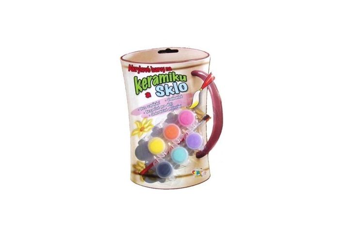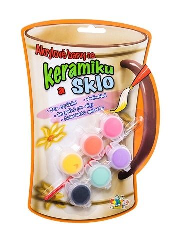 Bez zapékání, voděodolné. Obsahuje 6 barev á 3 ml v kalíškách, štětec. Bezpečné pro děti. Jednoduché malování. Vodou ředitelné a možnost vzájemně barvy míchat k docílení širší barevné palety.
