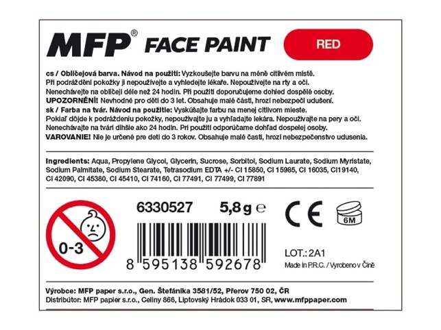 Barva na obličej červená, na principu rtěnky (6g) - Díky těmto pestrým barvám vykouzlíte na tváři dítěte krásnou masku na karneval, párty nebo jinou oslavu. Dermatologicky testováno. NÁVOD NA POUŽITÍ: 1. Doporučujeme vyzkoušet barvičky na méně citlivém místě. 2. Dojde-li k podráždění pokožky, nepoužívejte a vyhledejte lékaře. 3. Nepoužívejte na rty a oči. 4. Barvičkami malujeme na suchou pokožku. 5. Jednoduše omyvatelné vodou a mýdlem, barvy zdravotně nezávadné. 6. Nedoporučujeme nechávat na obličeji déle než 24 hodin. 7. Při použití doporučujeme dohled dospělé osoby. VAROVÁNÍ: Nevhodné pro děti do 3 let, nebezpečí spolknutí malých částí. Uvedená cena je za 1 ks. Všech 12 ks je baleno v papírové krabičce.