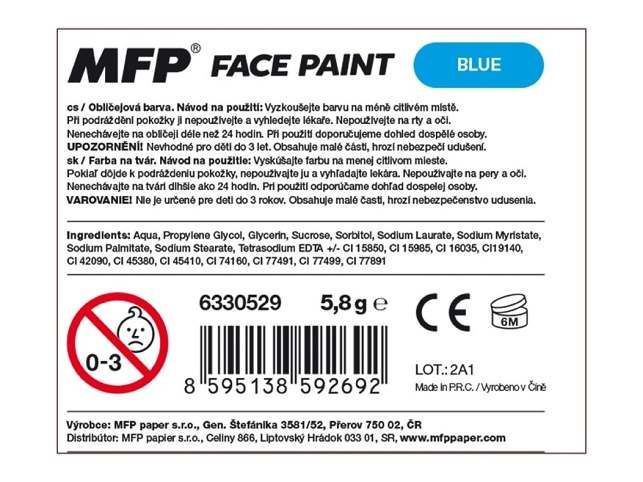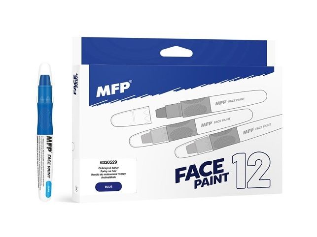 Barva na obličej modrá, na principu rtěnky (6g) - Díky těmto pestrým barvám vykouzlíte na tváři dítěte krásnou masku na karneval, párty nebo jinou oslavu. Dermatologicky testováno. NÁVOD NA POUŽITÍ: 1. Doporučujeme vyzkoušet barvičky na méně citlivém místě. 2. Dojde-li k podráždění pokožky, nepoužívejte a vyhledejte lékaře. 3. Nepoužívejte na rty a oči. 4. Barvičkami malujeme na suchou pokožku. 5. Jednoduše omyvatelné vodou a mýdlem, barvy zdravotně nezávadné. 6. Nedoporučujeme nechávat na obličeji déle než 24 hodin. 7. Při použití doporučujeme dohled dospělé osoby. VAROVÁNÍ: Nevhodné pro děti do 3 let, nebezpečí spolknutí malých částí. Uvedená cena je za 1 ks. Všech 12 ks je baleno v papírové krabičce.